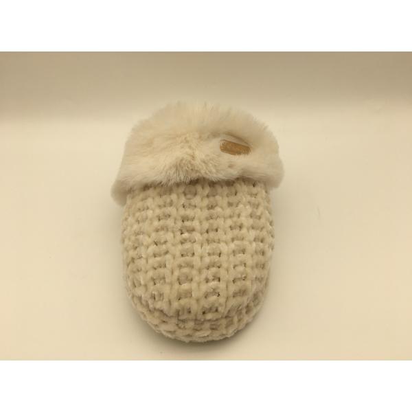 soft knit / fur with folded, small flower design, round and square decorate stitching with folded, flat metallic buckle with brushed finish, full fure sock without decorate, knit to cover in one unit TPR outsole with pusable latex